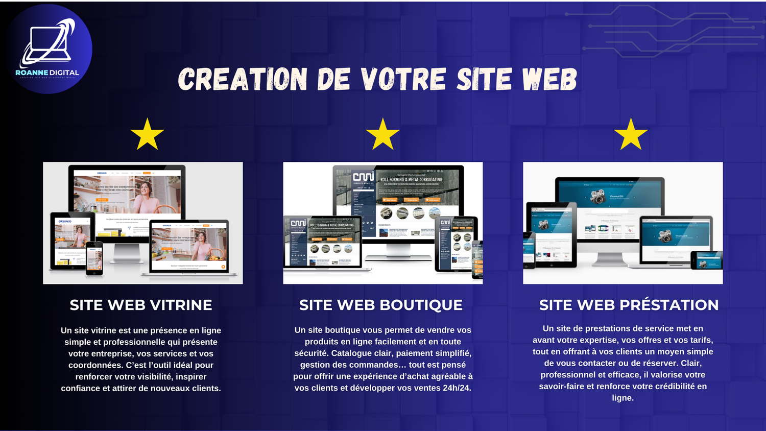 Conception de sites web modernes, performants et adaptés à vos besoins, que ce soit pour présenter votre activité, vendre vos services ou améliorer votre visibilité en ligne.